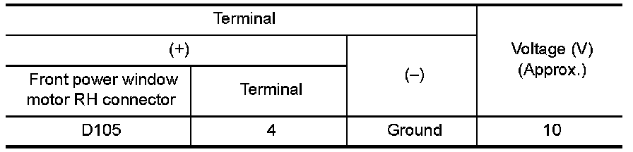 2.Check voltage between front power window motor RH connector and ground.