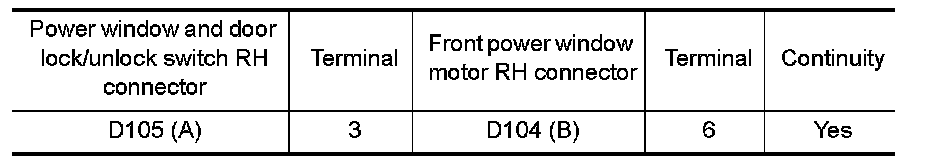 3.Check continuity between power window and door lock/unlock switch RH connector (A) and front power window motor RH connector (B).