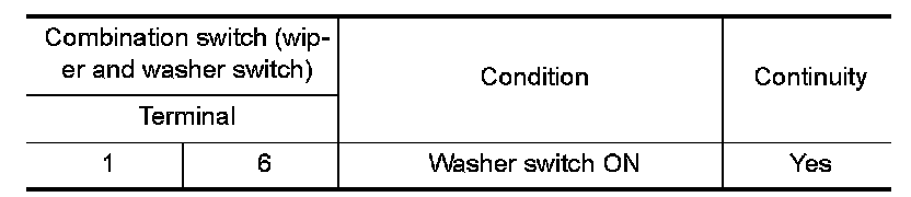 3.Check continuity between the combination switch (wiper and washer switch) terminals.