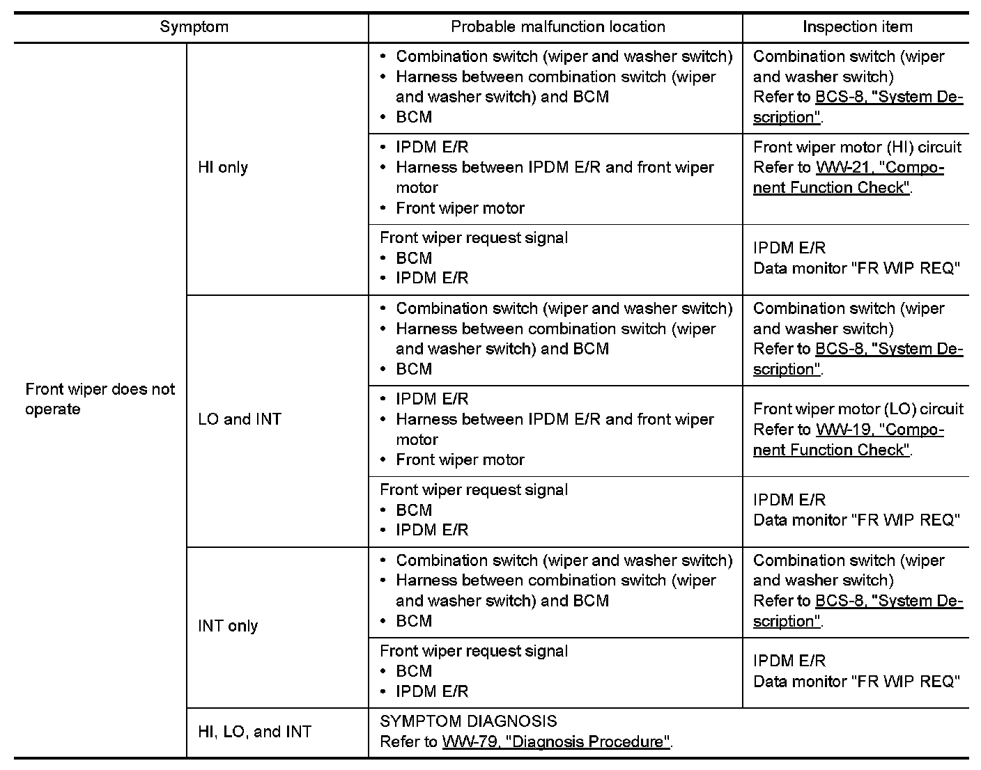 FRONT WIPER AND WASHER SYSTEM SYMPTOMS