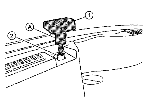 2.Push washer nozzle tab (A), to release the washer nozzle (1) from the cowl top cover, then disconnect the washer nozzle hose (2).