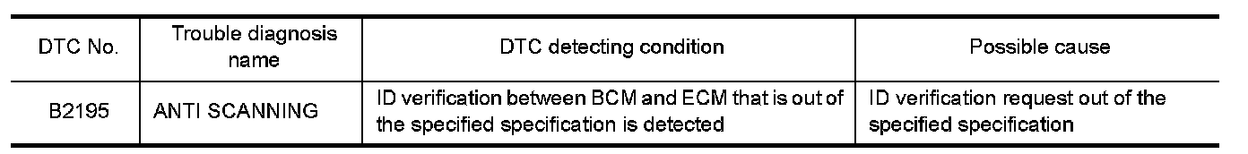 When ignition switch is turned ON, BCM performs ID verification with ECM. If ID verification that is out of the specified specification is detected, BCM prohibits further ID verification and engine cranking.