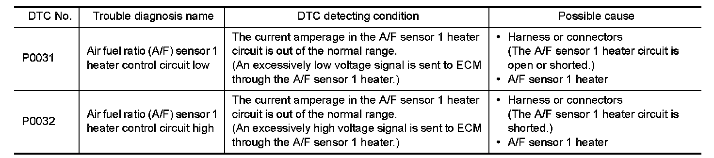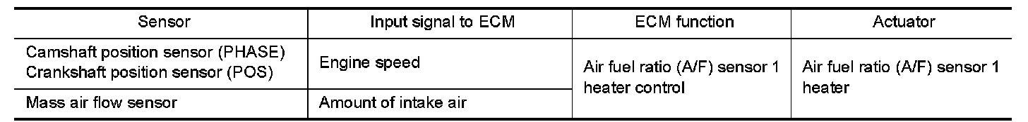 The ECM performs ON/OFF duty control of the A/F sensor 1 heater corresponding to the engine operating condition to keep the temperature of A/F sensor 1 element at the specified range.