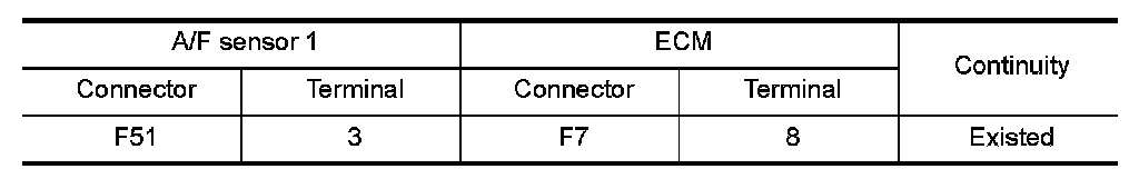 3.Check the continuity between A/F sensor 1 harness connector and ECM harness connector.