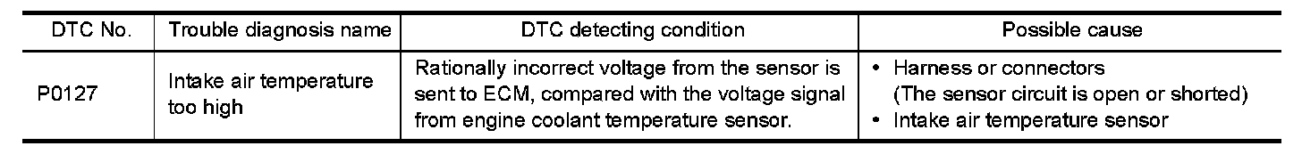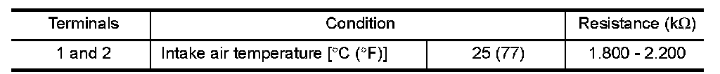The intake air temperature sensor is built-into mass air flow sensor (1). The sensor detects intake air temperature and transmits a signal to the ECM.