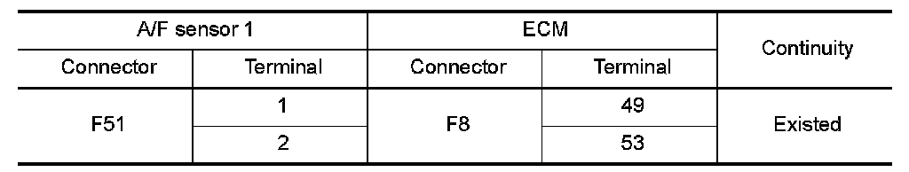 3.Check the continuity between A/F sensor 1 harness connector and ECM harness connector.