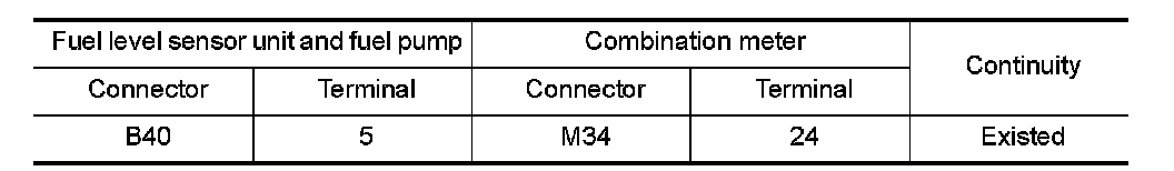 - Harness for open or short between "fuel level sensor unit and fuel pump" and combination meter