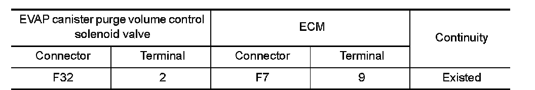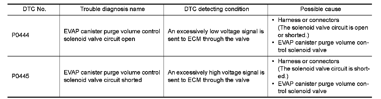 - Harness for open or short between EVAP canister purge volume control solenoid valve and ECM
