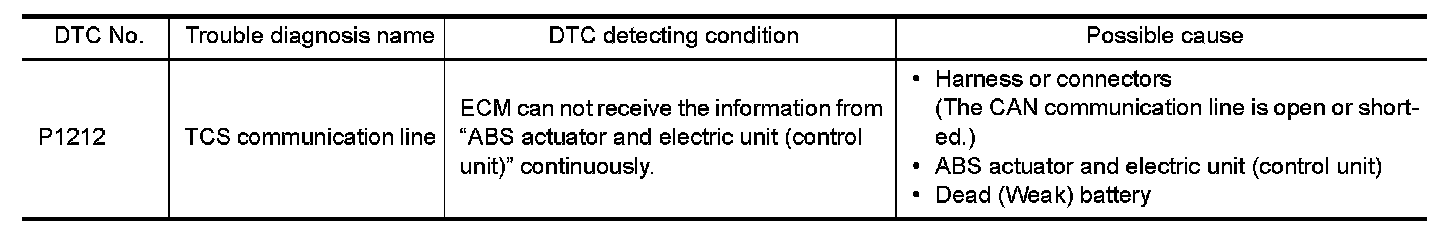 This CAN communication line is used to control the smooth engine operation during the TCS operation. Pulse signals are exchanged between ECM and "ABS actuator and electric unit (control unit)".