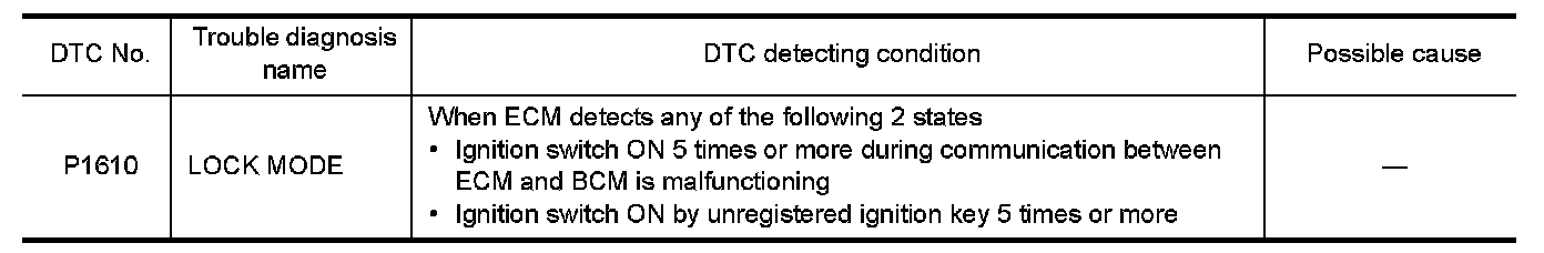 ECM forcibly switches to the mode that inhibits engine start, when engine start operation is performed 5 times or more while communication between ECM and BCM is not normal, and when engine start operation is performed 5 times or more by unregistered ignition key.