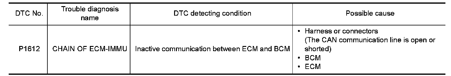 - If DTC P1612 is displayed with DTC U1000, first perform the trouble diagnosis for DTC U1000. Refer to