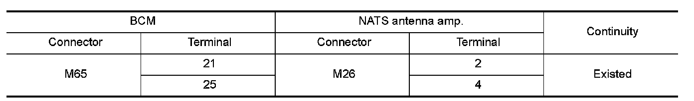 2.Check continuity between BCM harness connector and NATS antenna amp. harness connector.