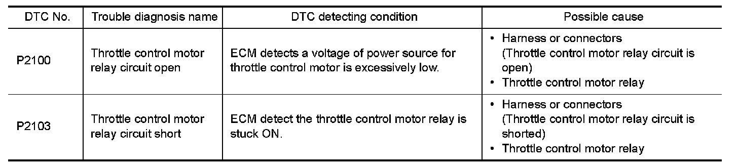 Power supply for the throttle control motor is provided to the ECM via throttle control motor relay. The throttle control motor relay is ON/OFF controlled by the ECM. When the ignition switch is turned ON, the ECM sends an ON signal to throttle control motor relay and battery voltage is provided to the ECM. When the ignition switch is turned OFF, the ECM sends an OFF signal to throttle control motor relay and battery voltage is not provided to the ECM.