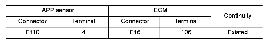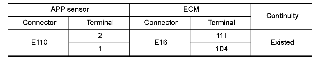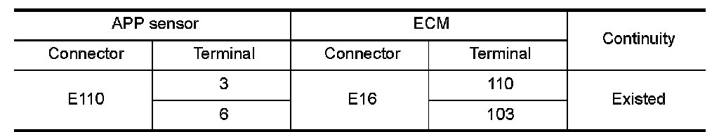 1.Check the continuity between APP sensor harness connector and ECM harness connector as per the following.