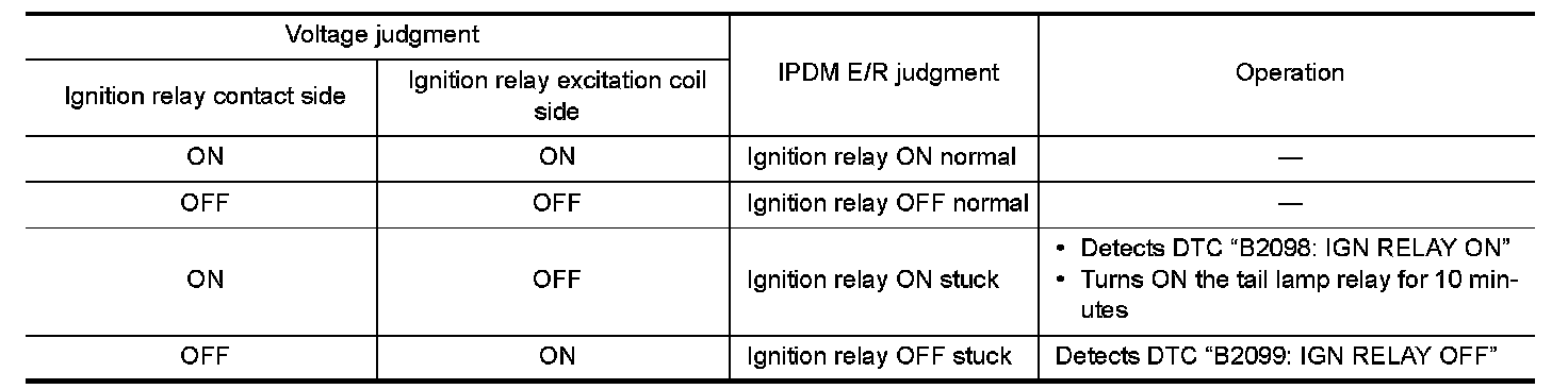 - IPDM E/R judges the ignition relay error if the voltage differs between the contact circuit and the excitation coil circuit.