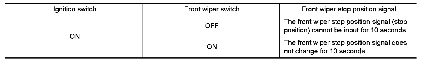 When a front wiper stop position signal is in the conditions listed below, IPDM E/R stops power supply to wiper after repeating a front wiper 10 seconds activation and 20 seconds stop five times.