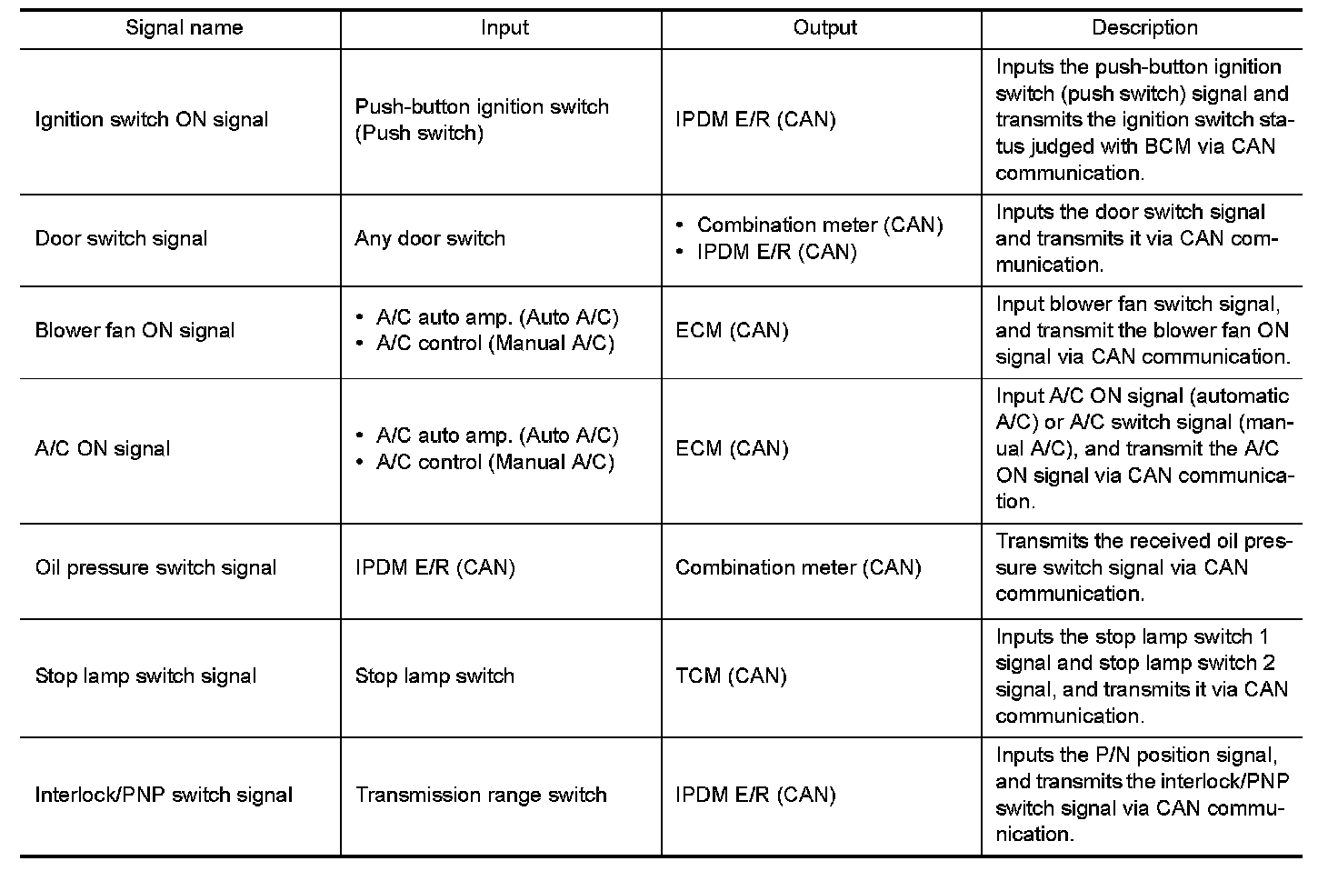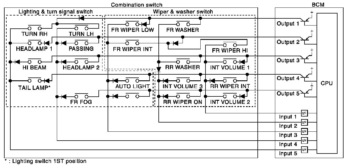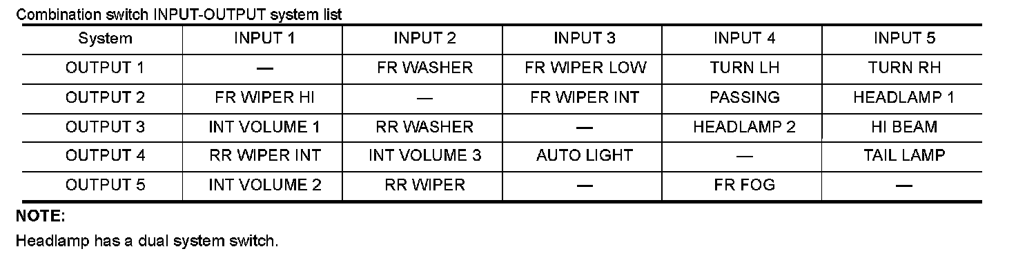- BCM detects the combination switch status signal "5AD" when the signals of OUTPUT 1 and OUTPUT 4 are input to INPUT 5.