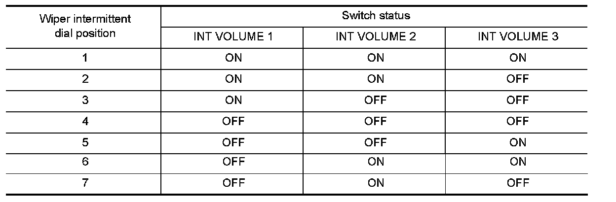 BCM judges the wiper intermittent dial 1 - 7 by the status of INT VOLUME 1, 2 and 3 switches.