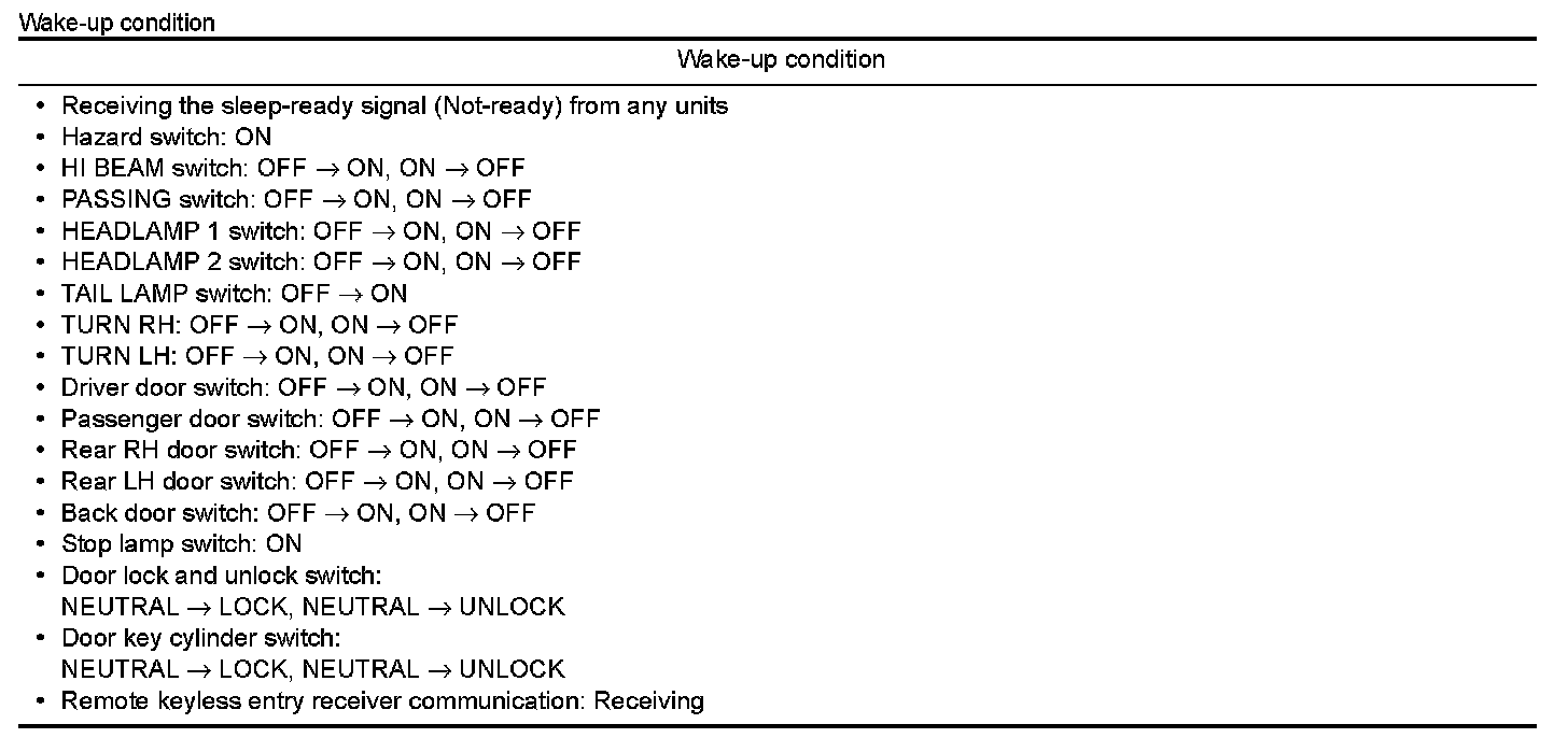 - BCM transmits sleep wake up signal (wake up) to each unit when any condition listed below is established, and then goes into normal mode from low power consumption mode.