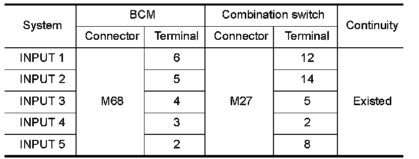 3.Check continuity between BCM harness connector and combination switch harness connector.