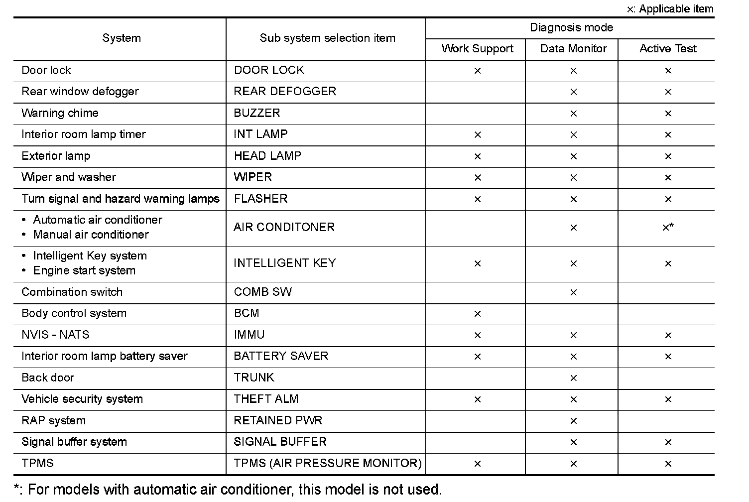 It can perform the diagnosis modes except the following for all sub system selection items.