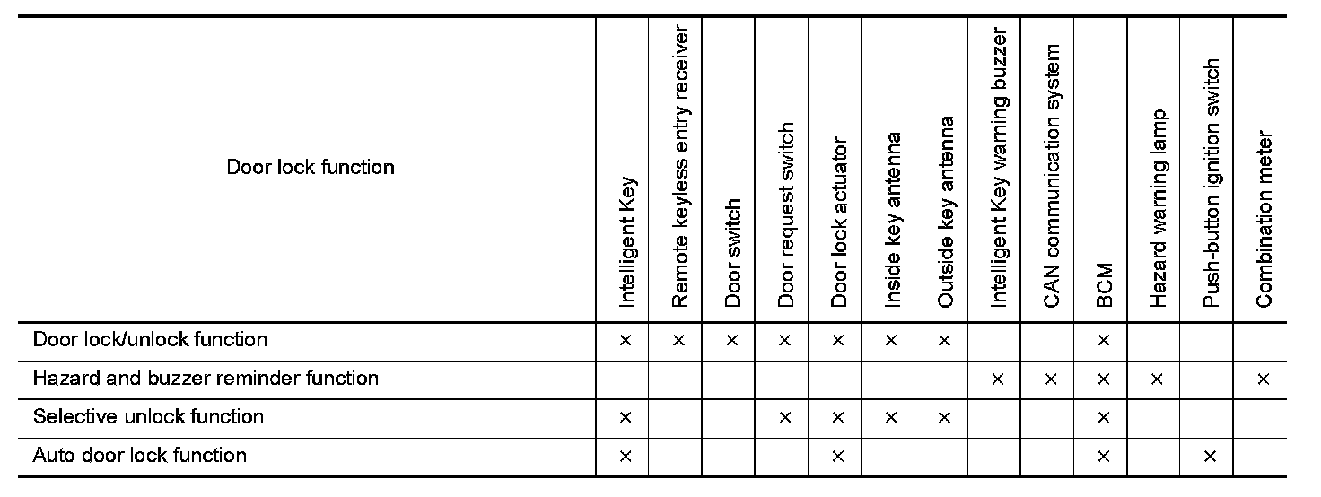 - BCM lock/unlock each door and sounds Intelligent Key buzzer warning (lock: 2 time, unlock: 1 times) at the same time as a reminder.