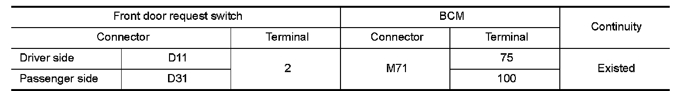 2.Check continuity between malfunctioning front door request switch harness connector and BCM harness connector.