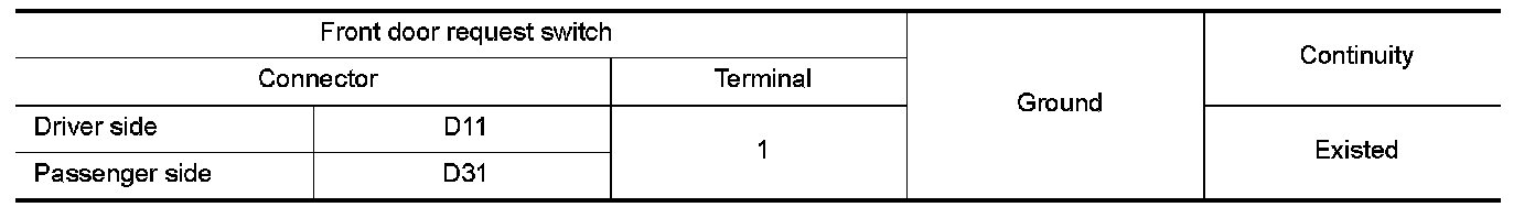 3.Check continuity between malfunctioning front door request switch harness connector and ground.