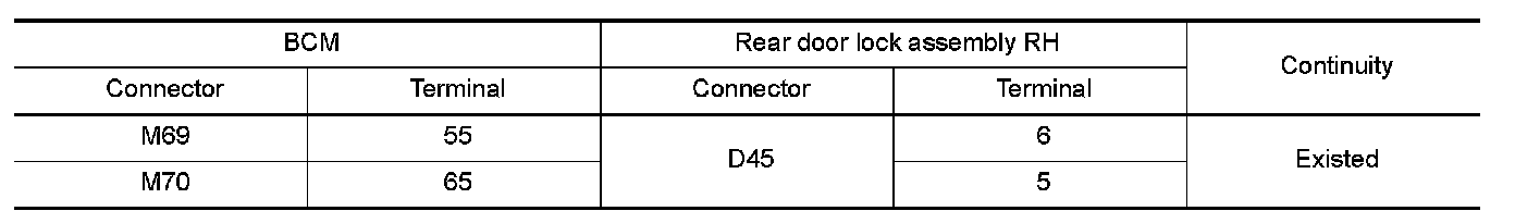 2.Check continuity between BCM harness connector and rear door lock assembly RH harness connector.