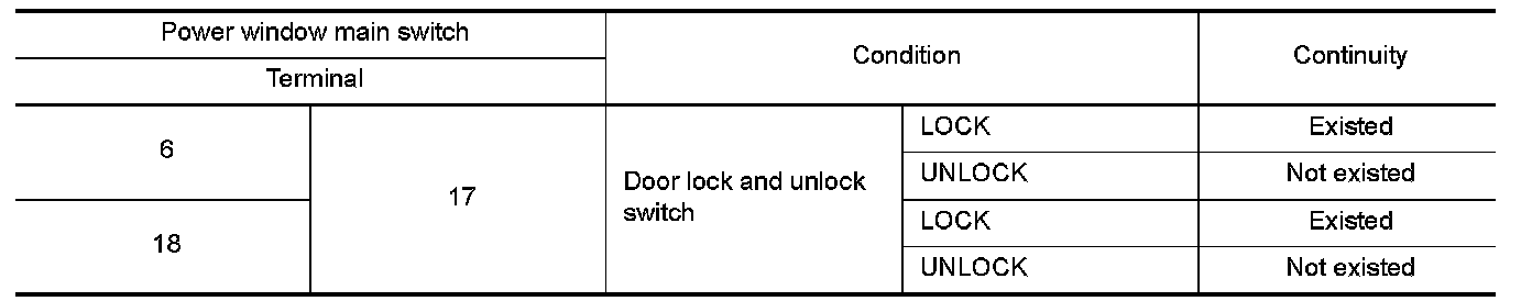 3.Check continuity between power window main switch (door lock and unlock switch) terminals.
