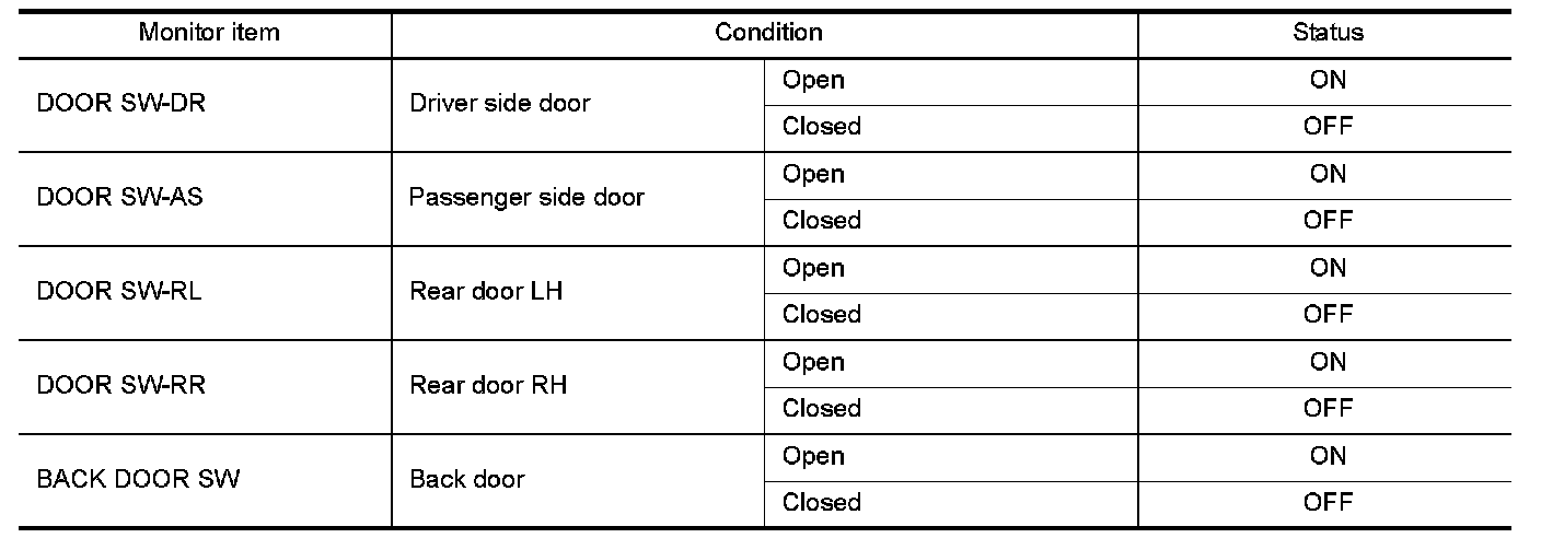 Check ("DOOR SW-DR", "DOOR SW-AS", "DOOR SW-RL", "DOOR SW-RR", "BACK DOOR SW") in "Data
