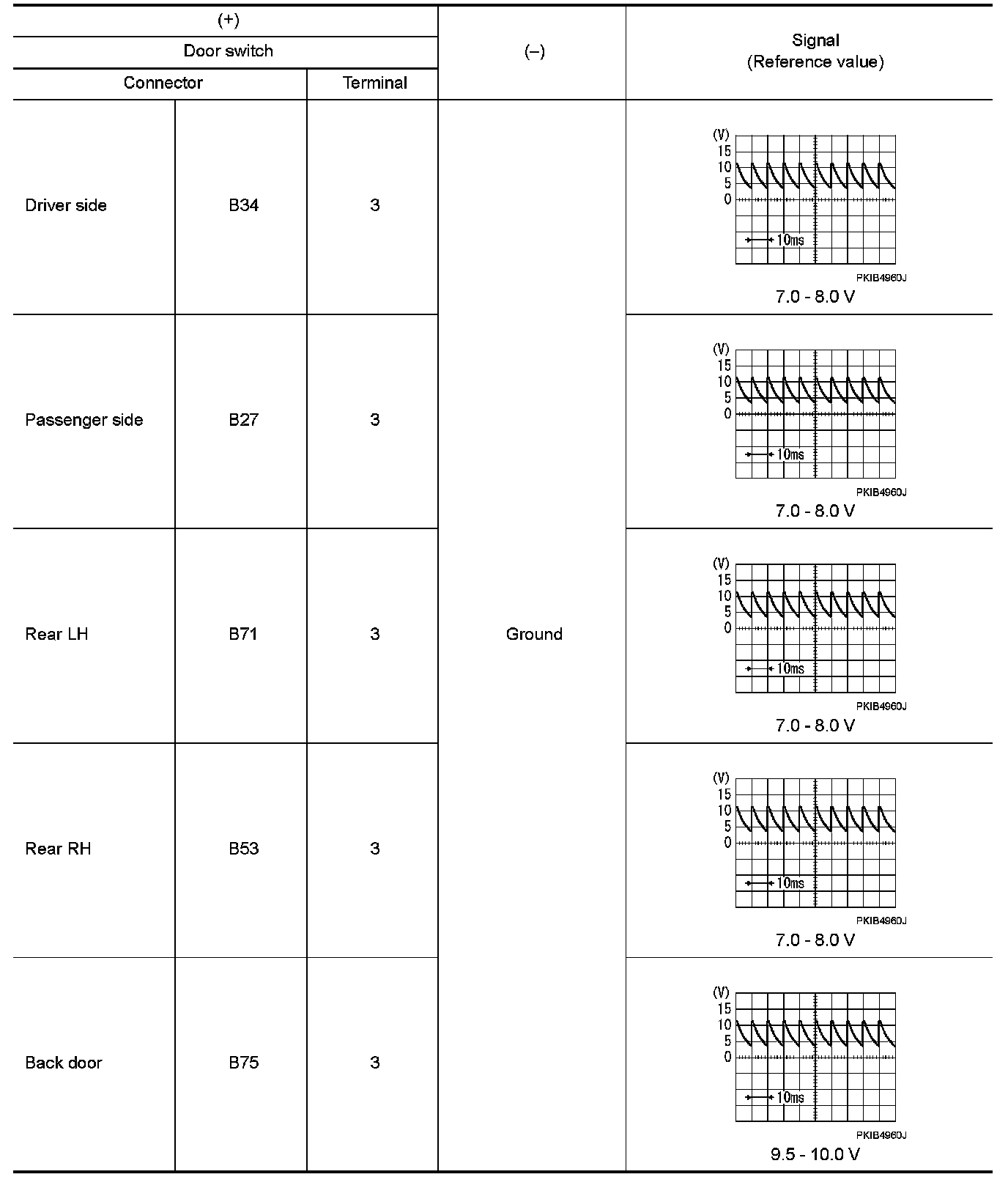 3.Check signal between malfunctioning door switch harness connector and ground with oscilloscope.
