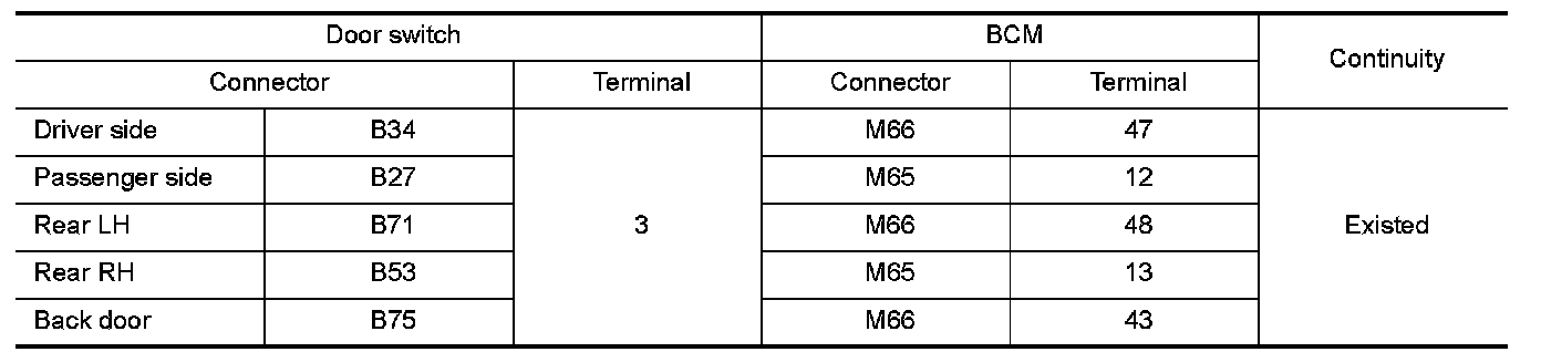 2.Check continuity between door switch harness connector and BCM harness connector.