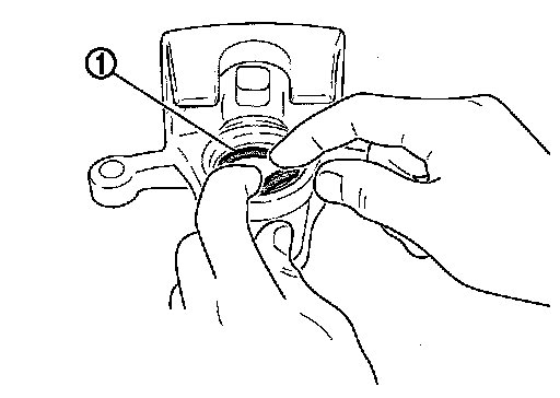 4.Apply brake fluid to pistons (1). Push piston into cylinder body by hand and push piston boot (2) piston-side lip into the piston groove.