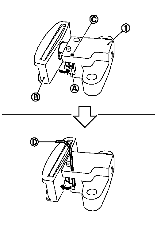 b.Insert a stopper pin (D) into tensioner body hole (C) to secure the oil pump chain tensioner slack guide.