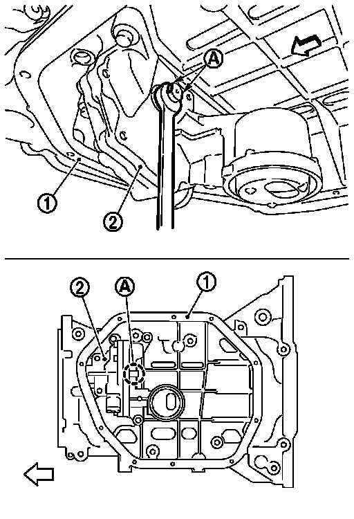 a.Press stopper tab (A) in the direction shown in the figure to push the oil pump chain tensioner slack guide (B) toward oil pump chain tensioner (1).