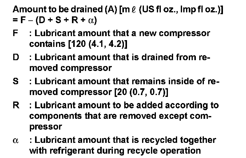Example: Lubricant amount to be drained from a new compressor when replacing compressor and liquid tank [ml (US fl oz., Imp fl oz.)] [D = 60 (2.0, 2.1), alpha = 5 (0.2, 0.2)]
