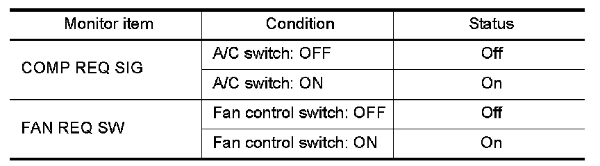 Check the "COMP REQ SIG" or "FAN REQ SW" in "DATA MONITOR" of BCM.