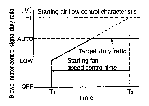 - A/C auto amp. changes duty ratio of blower motor drive signal and controls air flow continuously. When air flow is increased, duty ratio of blower motor drive signal gradually increases to prevent a sudden increase in air flow.