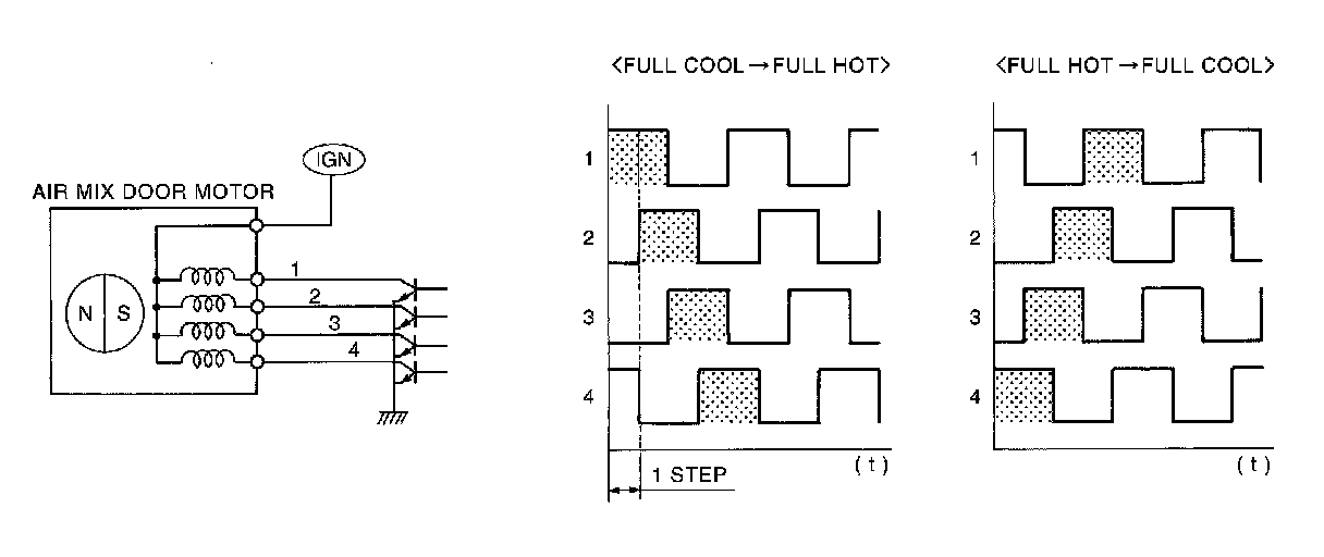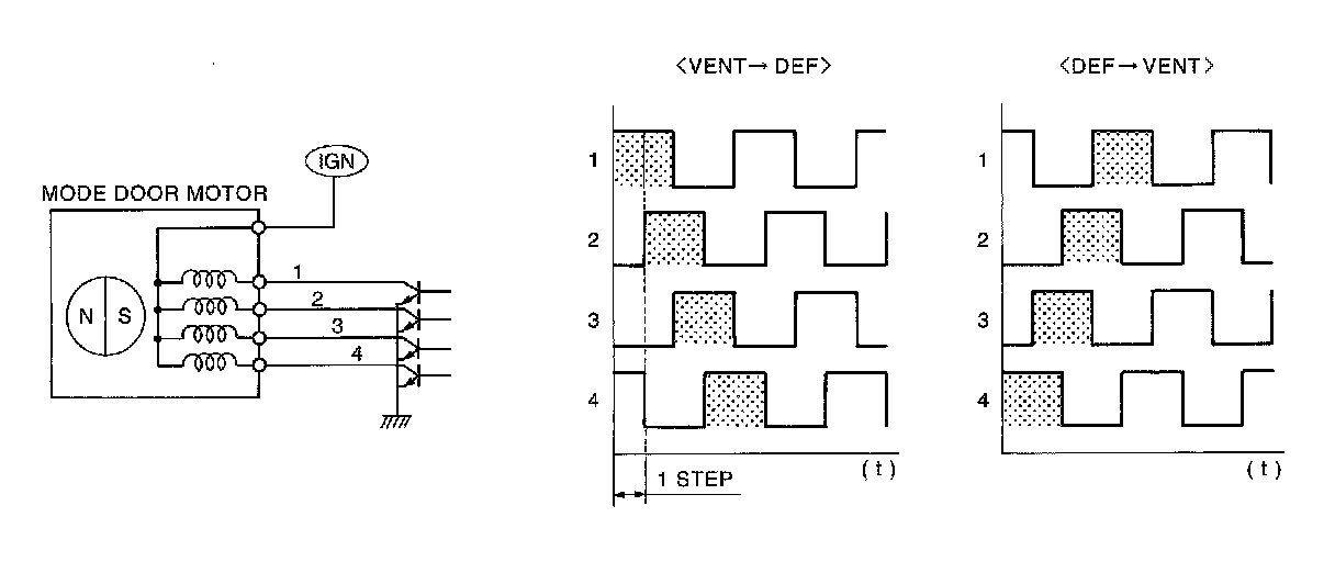 The A/C auto amp. receives data from each sensors. When a drive signal is input from A/C auto amp. to door motor, a step motor built into the door motor rotates according to the drive signal, and then stops at the position of target door.