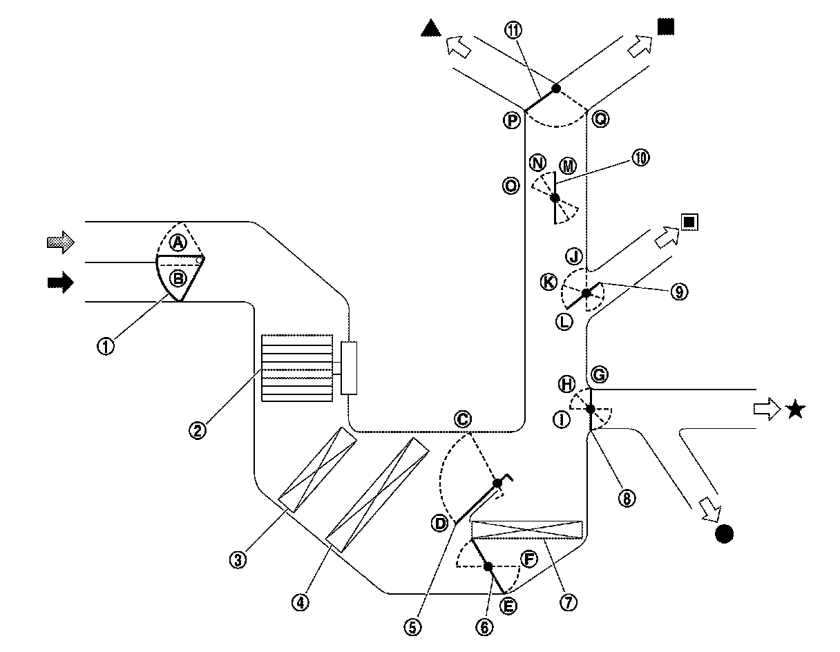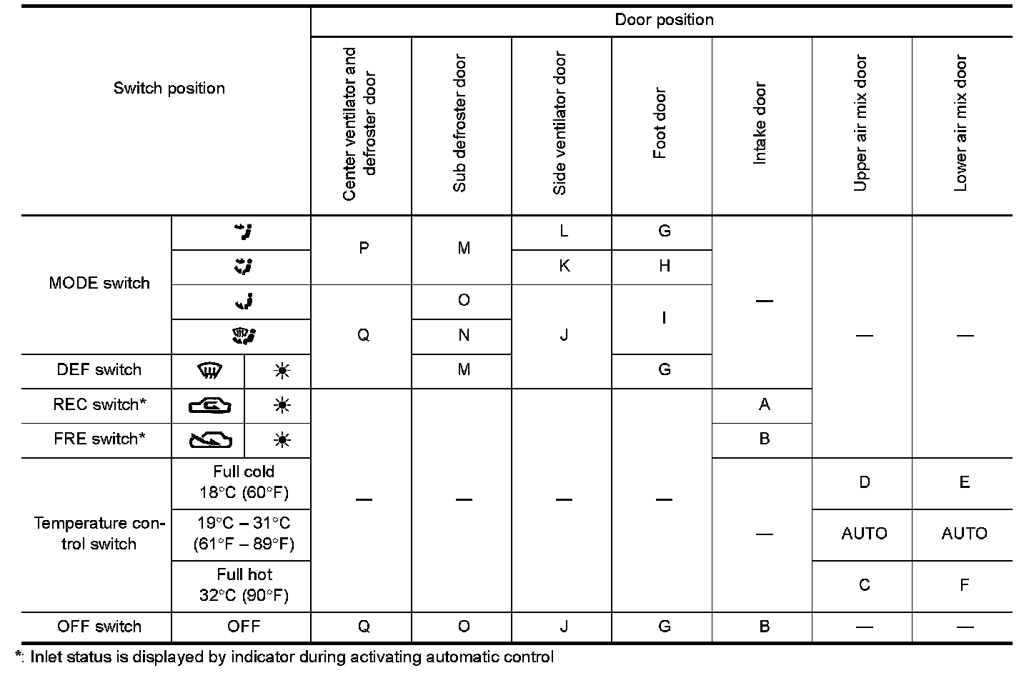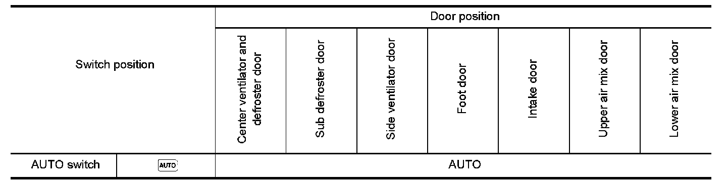 - While air outlet is in automatic control, A/C auto amp. selects the mode door position depending on a target air mix door angle and outlet air temperature calculated from sunload.
