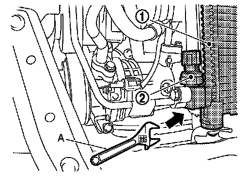 4.Use a adjustable wrench (A) or other tool to hold the refrigerant pressure sensor mounting block, and then remove the refrigerant pressure sensor (2) from the condenser (1).