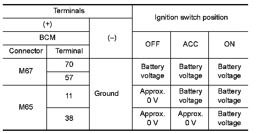 3.Check voltage between BCM harness connector and ground.