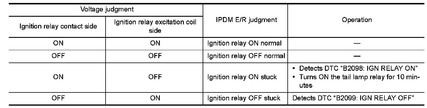 - IPDM E/R judges the ignition relay error if the voltage differs between the contact circuit and the excitation coil circuit.