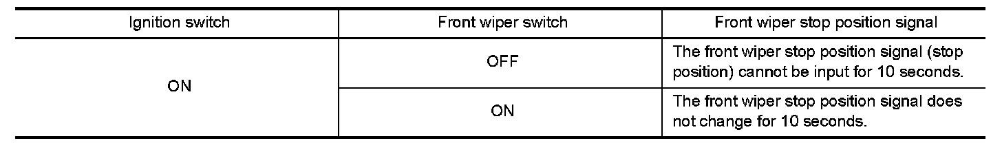 When a front wiper stop position signal is in the conditions listed below, IPDM E/R stops power supply to wiper after repeating a front wiper 10 seconds activation and 20 seconds stop five times.