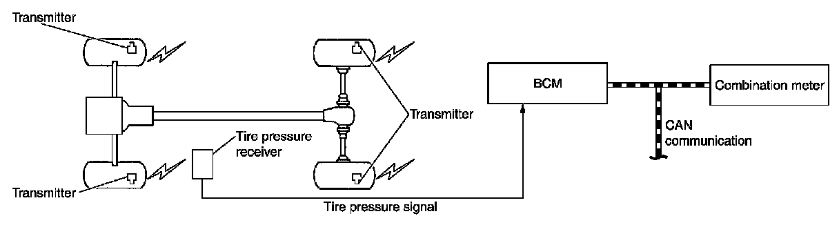 During driving, the TPMS (Tire Pressure Monitoring System) receives the signal transmitted from tire pressure sensor installed in each wheel. The BCM (Body Control Module) of this system has pressure judgment and trouble diagnosis functions. When the tire pressure monitoring system detects low inflation pressure or another unusual symptom, the low tire pressure warning lamps in the combination meter. comes on.