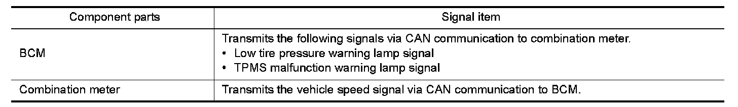 Uses CAN communication from the BCM to illuminate the low tire pressure warning lamp on the combination meter.