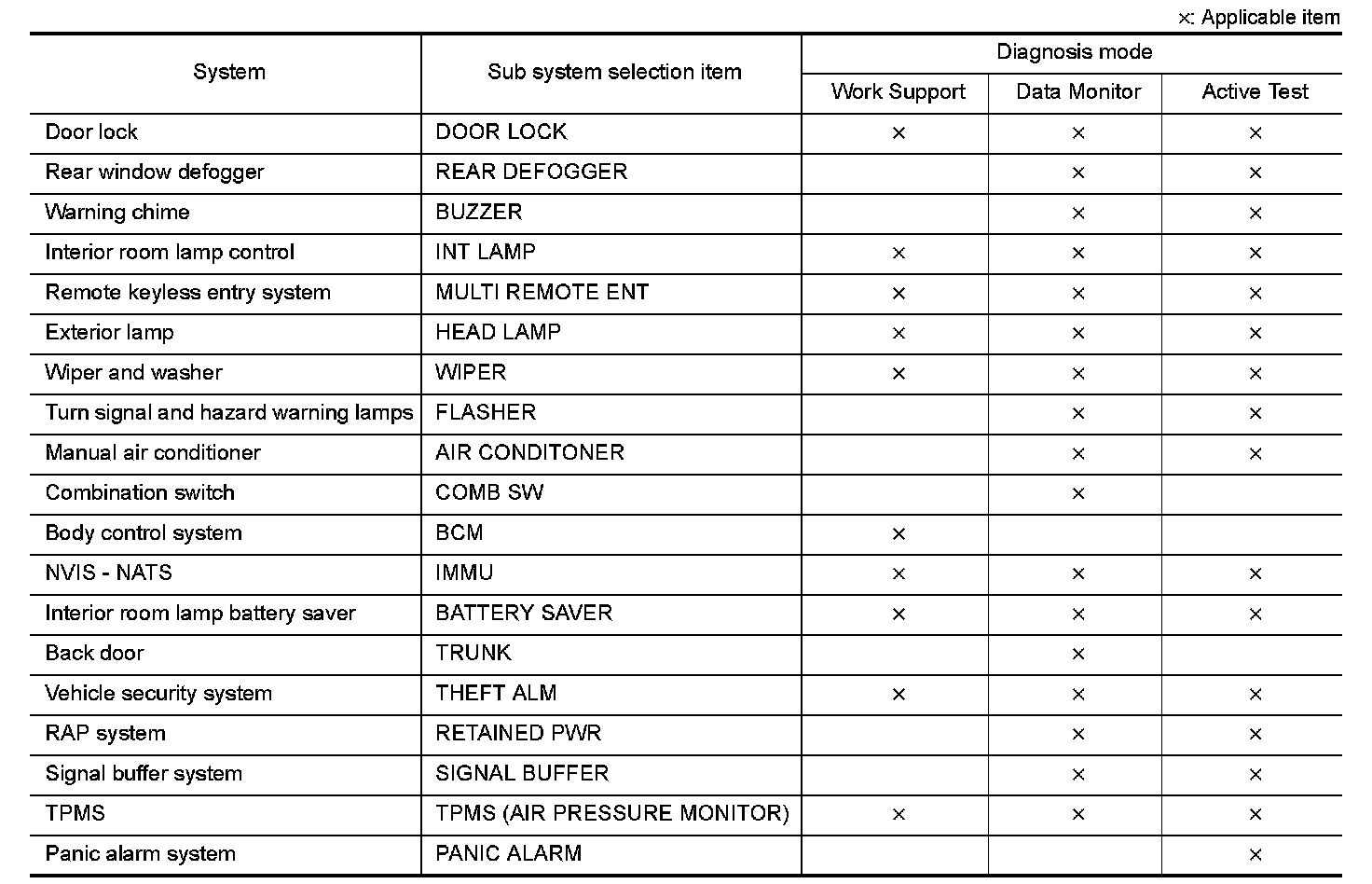 DIAGNOSIS SYSTEM (BCM) (WITHOUT INTELLIGENT KEY SYSTEM)
