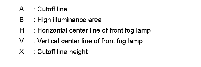 4.Adjust the cutoff line height (A) with the aiming adjustment screw so that the distance (X) between the horizontal center line of front fog lamp (H) and (A) becomes 200 mm (7.87 in).