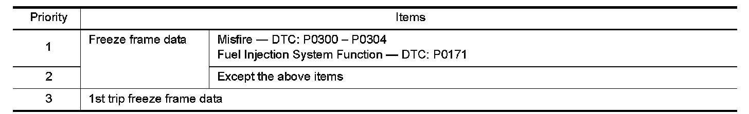 For example, the EGR malfunction (Priority: 2) was detected and the freeze frame data was saved in the 2nd trip. After that when the misfire (Priority: 1) is detected in another trip, the freeze frame data will be updated from the EGR malfunction to the misfire. The 1st trip freeze frame data is updated each time a different malfunction is detected. There is no priority for 1st trip freeze frame data. However, once freeze frame data is stored in the ECM memory, 1st trip freeze data is no longer stored (because only one freeze frame data or 1st trip freeze frame data can be stored in the ECM). If freeze frame data is stored in the ECM memory and freeze frame data with the same priority occurs later, the first (original) freeze frame data remains unchanged in the